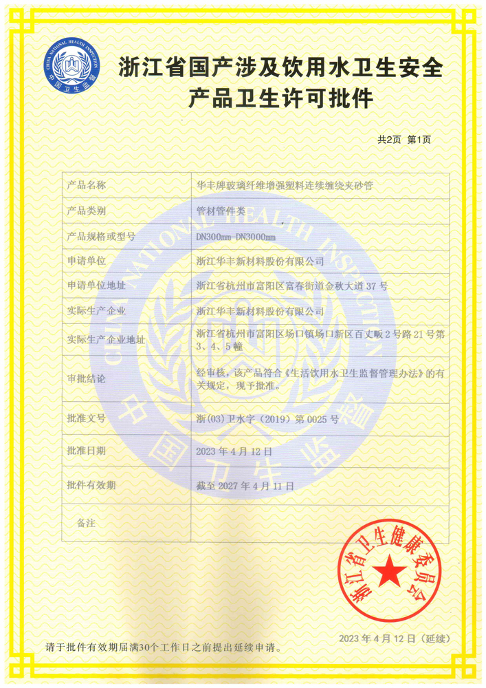 連續纏繞玻璃鋼管衛生許可批件2